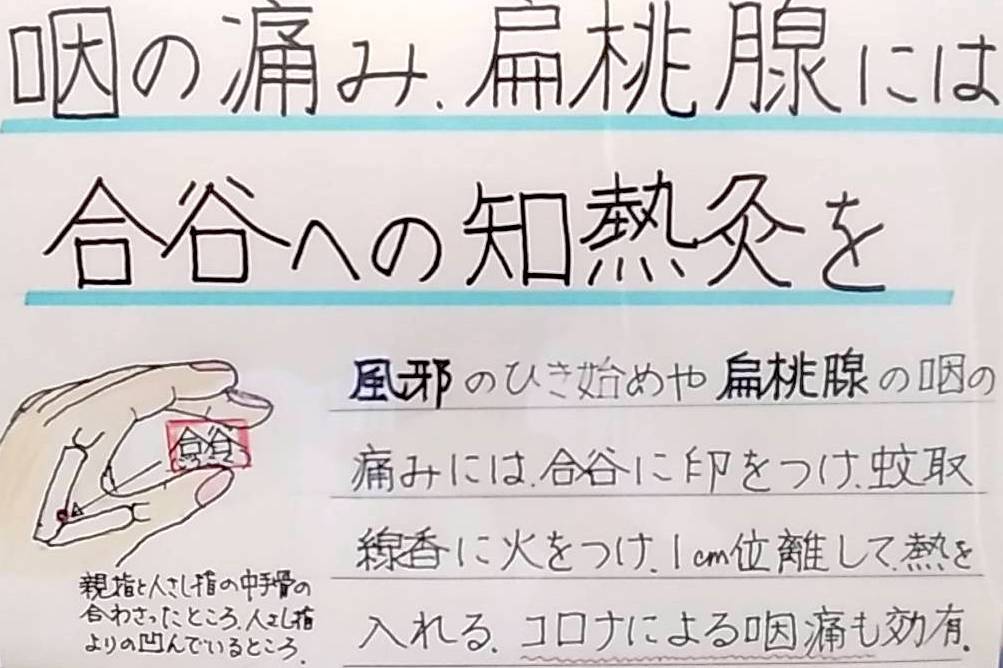 痛みには、合谷に印をつけ、蚊取線香に火をつけ、1cm位離して熱を入れる。コロナによる咽痛も効有。